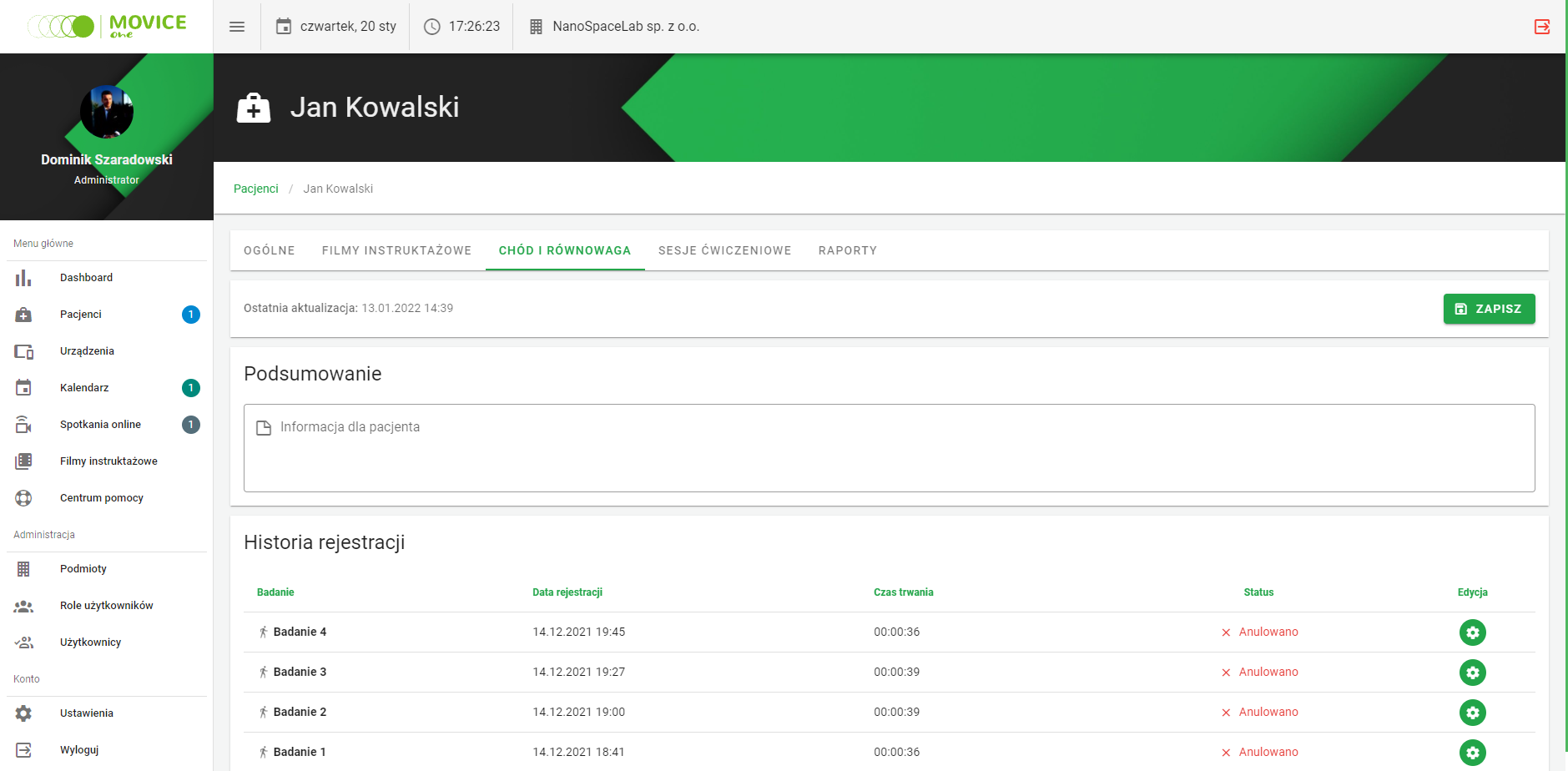 Monitorowanie rehabilitacji online z analizą ruchu i zaawansowanymi algorytmami. Platforma oferuje parametryczną prezentację wyników i postępów pacjentów.