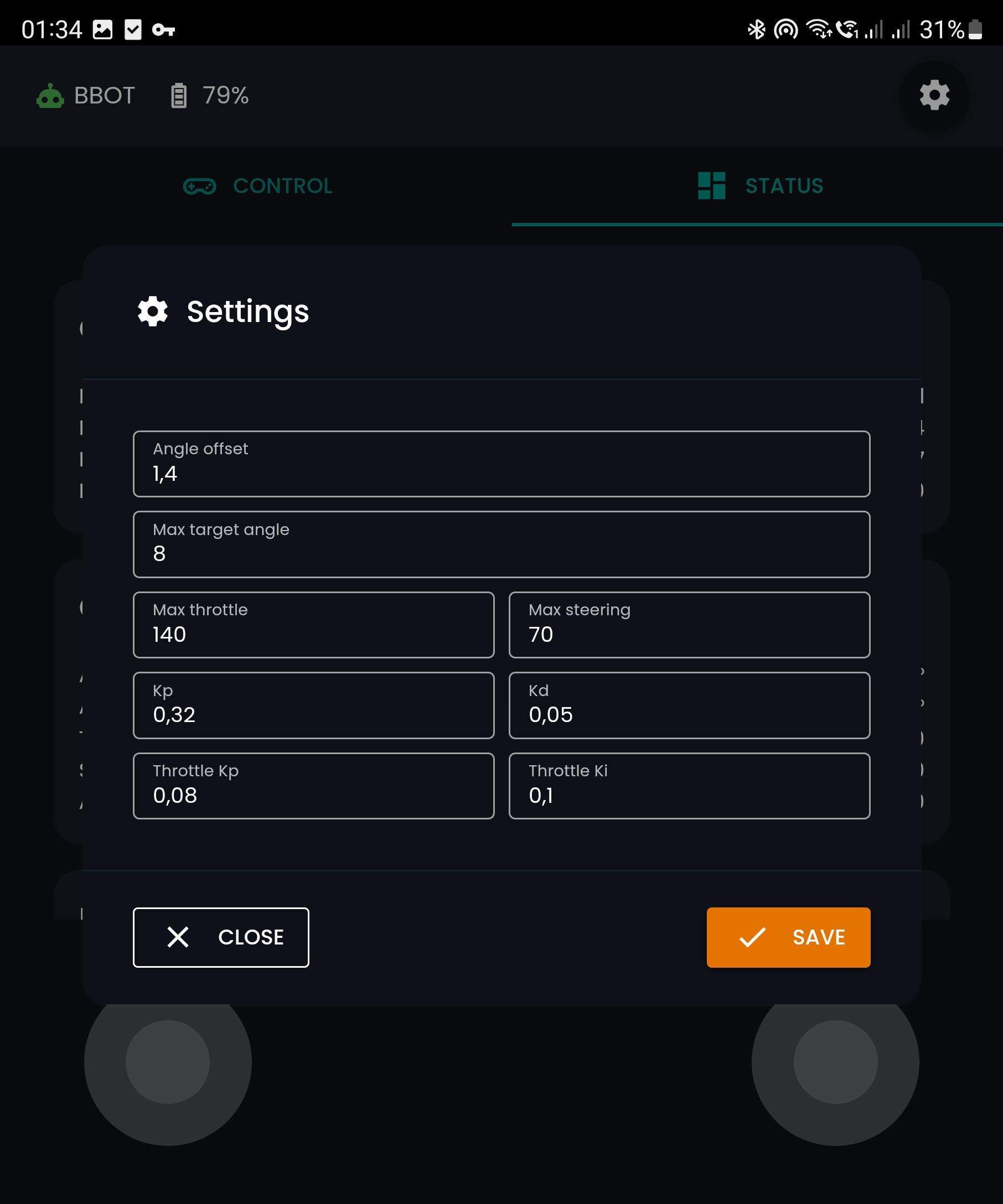 Samobalansujący robot z aplikacją mobilną do zdalnego sterowania, z funkcjami monitorowania i dostosowywania parametrów balansu.